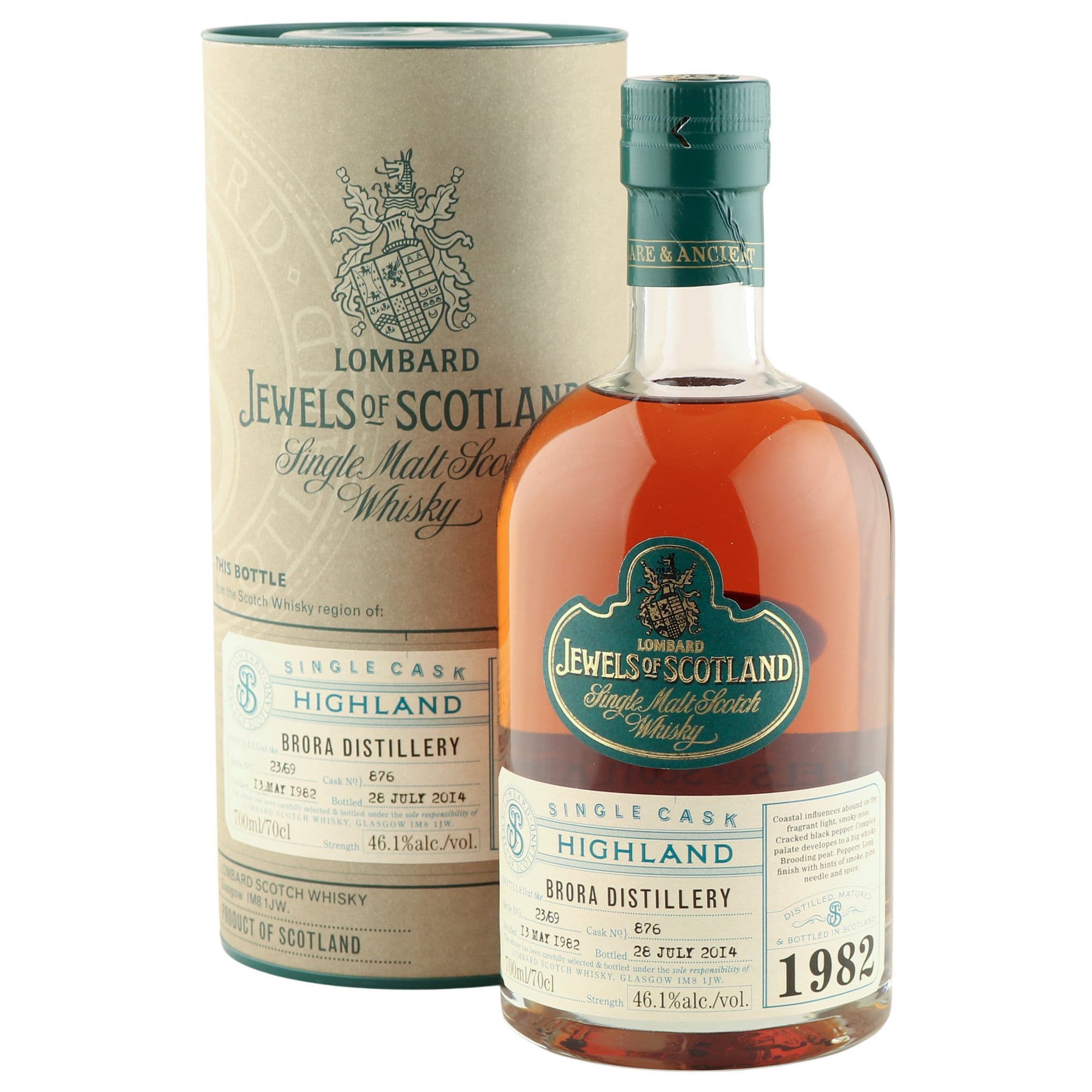 An exceptionally rare and distinguished single malt, the Brora 1982 32 year old was bottled on the 28th July 2014 by Lombard as part of their prestigious Jewels of Scotland series.