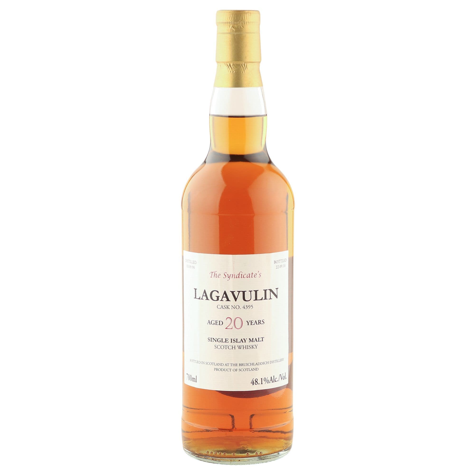 This cask strength 20 year old Islay single malt was distilled at Lagavulin on the 3rd September 1990 and bottled at 48.1% ABV, from cask number 4395, on the 22nd September 2010 for The Syndicate's series.